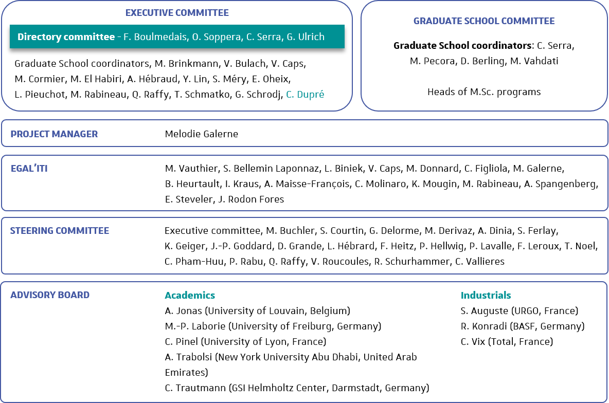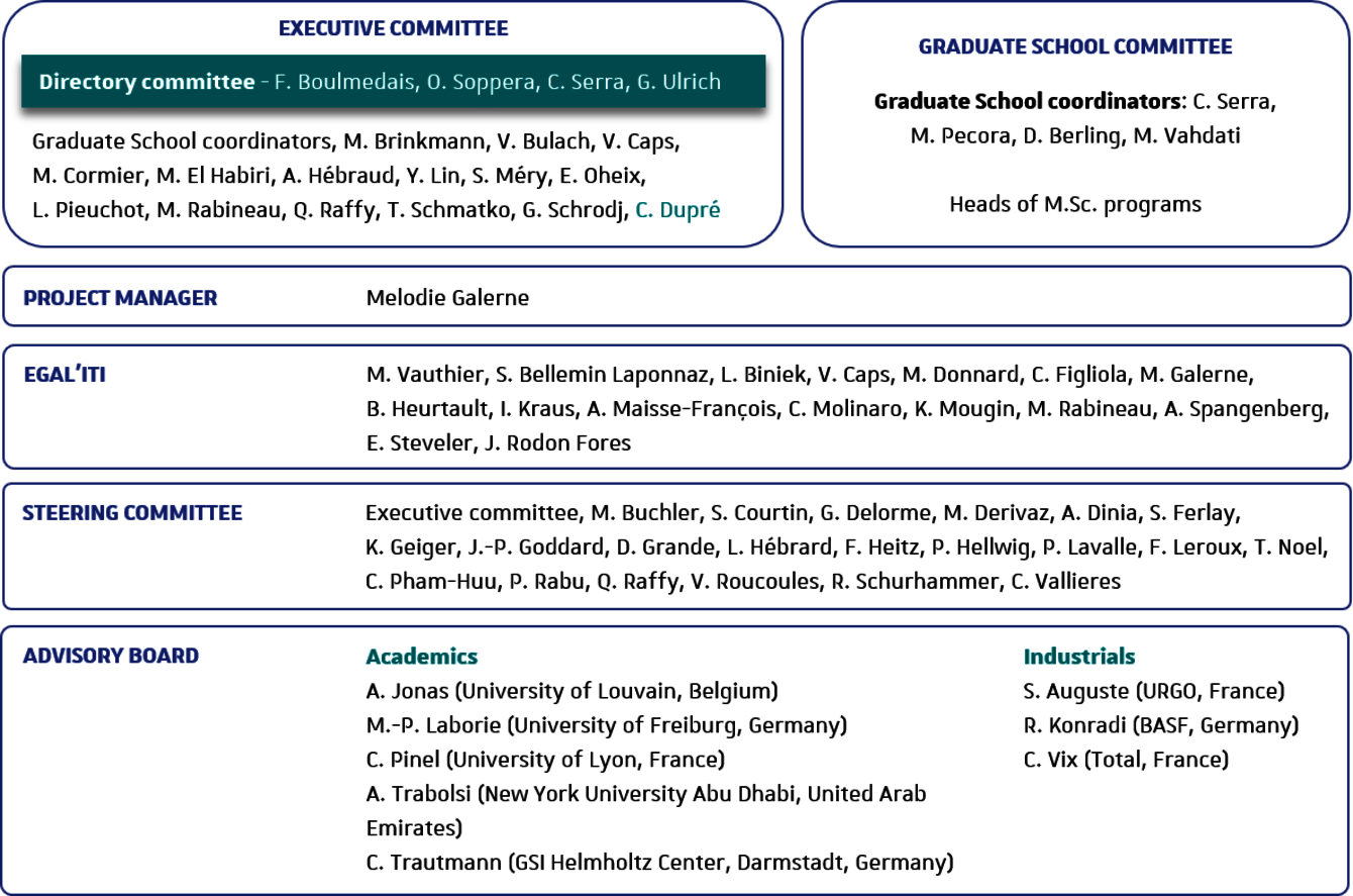 The steering committee (comité de Pilotage) is headed by the directory committee, and consists of representatives of the 9 research institues, the different faculties, engineering schools, doctoral schools and partner institutions. They meet annually to evaluate the institute's activities and suggest changes to better fulfill the institutes ambitions.