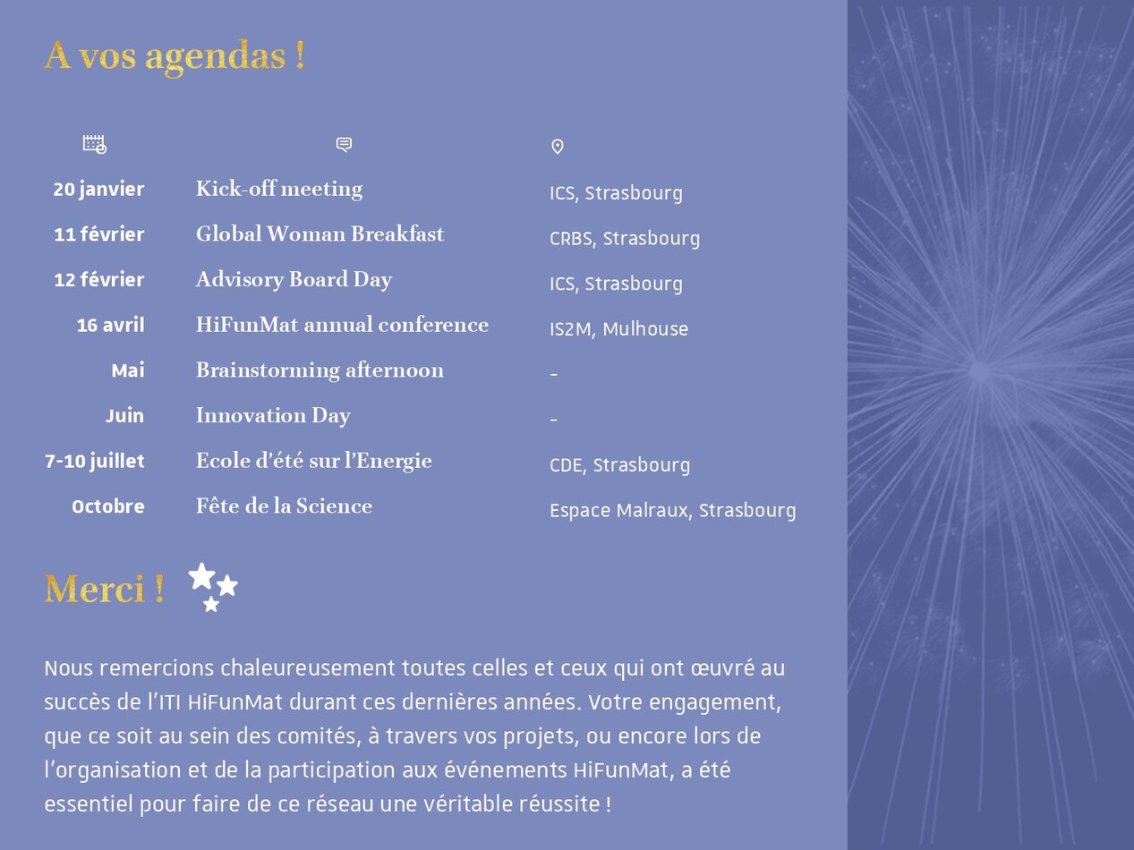 Our warmest thanks to all those who have contributed to the success of success of ITI HiFunMat over the last few years. Your commitment, whether on committees, through your projects, or in organizing and participating organizing and participating in HiFunMat events, has been essential in essential to the success of this network!