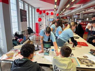 This year ITI HiFunMat returned with the stand ‘Materials of the futur’ to the André Malraux Library in Strasbourg, where we welcomed primary and secondary school students during the week, and all public during the weekend. As last year, the visitors were invited to explore the world of cutting-edge functional materials inspired by nature. A quiz game, specially adapted to the theme 'sports', was proposed to participants as well as manipulation samples under a microscope.